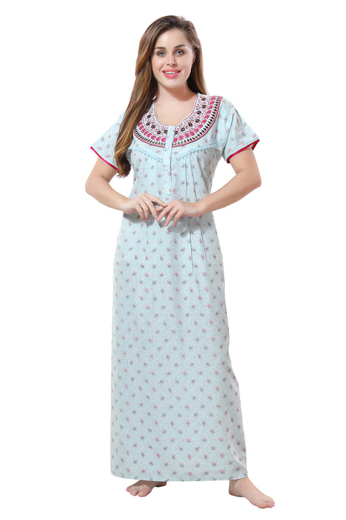 Botanical Print Satin Shirt & Pyjama Night Suit for Women, Light Turquoise -